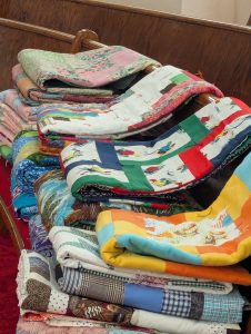 The stitchers start to gather at 9 am and enjoy fellowship over a sack lunch.