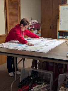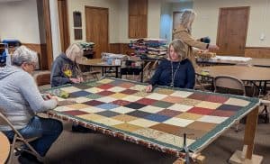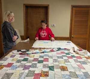 Anita Herker and Becky Gaston getting ready for the next quilt top to be assembled.