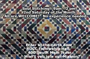 Saturday is Soul Stitching!  9 am and after. Check out all that is going on with the Ripley Stitchers on Soul Stitching Saturday! Pop in – grab a needle! No experience needed! Contact is Jane Knoop 319-478-8156 Potluck is shared with luncheon fellowship.